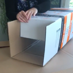 The branding should be facing upright. Fold the bottom four flaps inwards to form the base of the box. Taking the parcel tape and scissors, place tape along the join of the 2 outer flaps to secure them together. Use enough tape to make sure the base is sturdy.