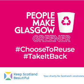 In the lead-up to COP26, Keep Scotland Beautiful has once again joined forces with Glasgow City Council and some of the city’s biggest coffee retailers to reactivate the #ChooseToReuse or #TakeItBack campaign. This will raise awareness of the existing opportunities to reuse and recycle cups in a total of 106 store locations across the city, with participating retailers Costa Coffee, McDonald’s, Pret A Manger, Caffè Nero and Starbucks.
